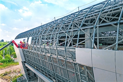 8月7日,在县旅游集散中心工地现场,工人们正进行外立面施工,抓紧时间为下一阶段做好充足准备。进入8月,天气晴雨交错,给我县各个项目建设带来巨大的挑战。针对此情况,东部新区旅游集散中心、博览中心和高新区各个新建厂房等各重点建设项目,按照“大雨暂停、小雨小干、晴天错峰”原则,“见缝插针”赶工期,确保各个项目保质保量完成预定目标。记者 魏瑞 摄