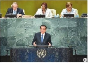 图⑪:2016年9月21日,李克强同志在纽约联合国总部出席第71届联合国大会以“可持续发展目标:共同努力改造我们的世界”为主题的一般性辩论并发表题为《携手建设和平稳定可持续发展的世界》的讲话。 新华社记者 李涛 摄