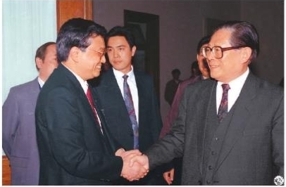 图②:1993年5月3日下午,中国共产主义青年团第十三次全国代表大会在北京人民大会堂开幕。在5月3日上午的预备会议后,举行第一次主席团会议,推选李克强等同志为主席团常务主席。这是江泽民同志与李克强同志握手。 新华社记者 郭占英 摄