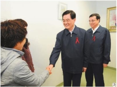 图③:2008年12月1日是第21个世界艾滋病日。胡锦涛同志和李克强同志来到北京地坛医院考察艾滋病防治工作。 新华社记者 马占成 摄