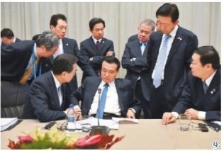 图⑨:2014年12月16日,李克强同志在贝尔格莱德出席第三次中国—中东欧国家领导人会晤。这是会谈间隙,他与随行部长进行会商。 新华社发