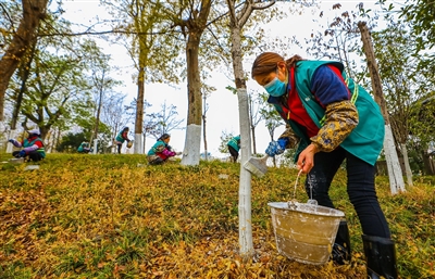 在冬季,考虑到天气变冷以及防病虫害,绿植养护人员为一排排行道树和公园绿植统一穿上“白裤子”,部分绿植还盖上的保温膜,确保其安全越冬。