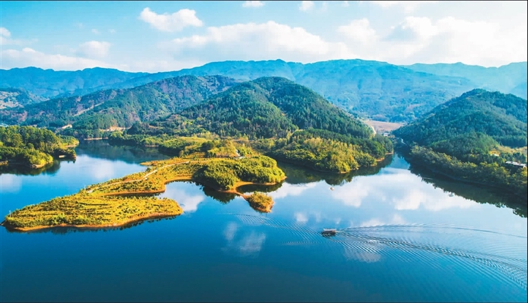 日前,在重庆市垫江县迎风湖国家湿地公园,蓝天碧水和游客船只相映成景,一幅美丽的生态画卷映入眼帘。龚长浩 摄