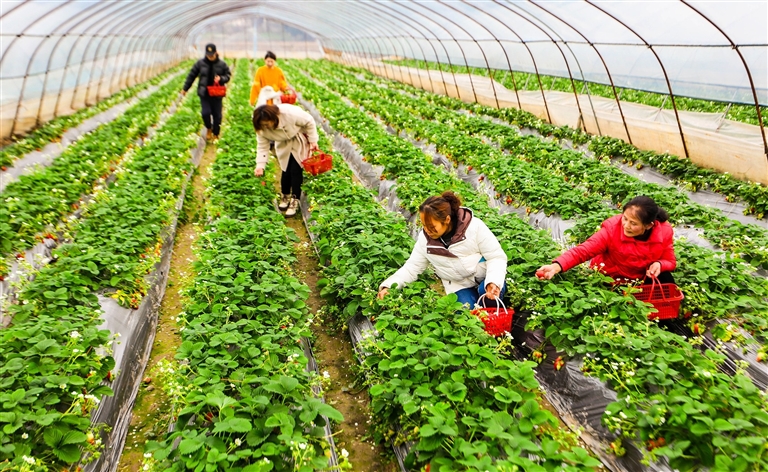 1月8日,太平镇永茂村草莓园,游客正在采摘新鲜的草莓。