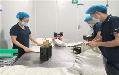 本报讯 (记者 周迎迎)10月18日上午9时,由大厨小榨油脂公司(以下简称:大厨小榨)与乡见(重庆)农产品有限公司(以下简称:乡见公司)合作生产的“明月汖”牌醇香菜籽油,正在打包发往各地。