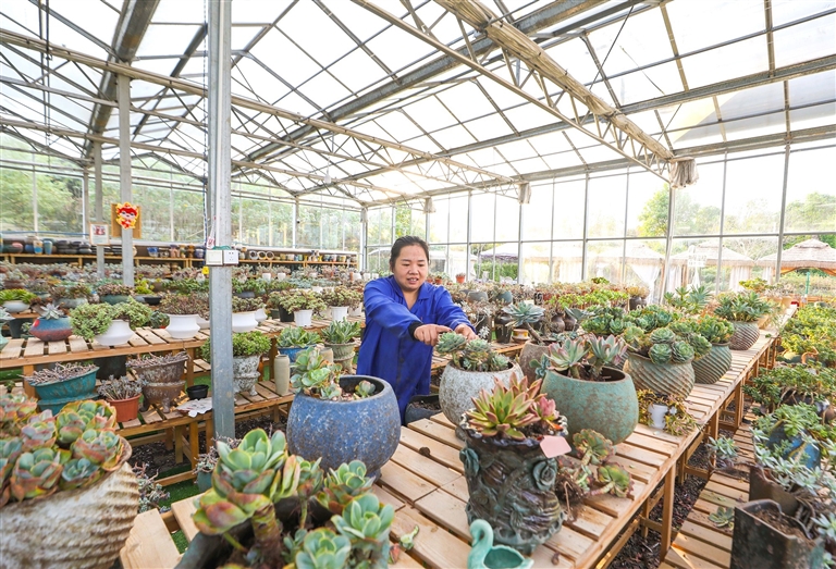 日前,在新民镇明月村多肉基地,工人正在管护多肉,以确保多肉长势良好。据了解,该基地培育的多肉植物有几十品种,并以“线上+线下”的经销模式,将其销往全国各地,有效助力乡村振兴。