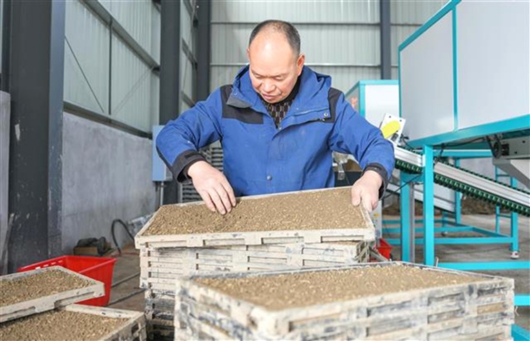 新民镇明月村育秧工厂建有2条育秧生产线,每小时能育秧4000盘,日供应2000亩田地需求,每年可为5万亩稻田提供高品质水稻秧苗,为春耕生产提供坚实保障。