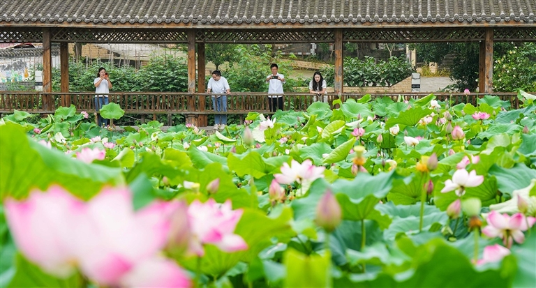 6月10日,沙坪镇毕桥村盛开的荷花与周边的农家乐相映成景,游客在赏花。