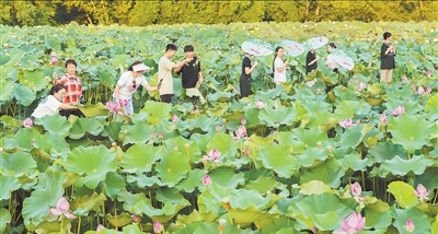 7月16日,垫江县沙坪镇双塘村荷花园,游客在赏花拍照。