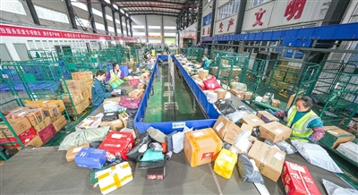 天刚蒙蒙亮,县快递分拨中心已是一片忙碌。来自全国各地的包裹,被快速准确地分拣、转运至城乡各个角落,最多每天要处理包裹约10万件。