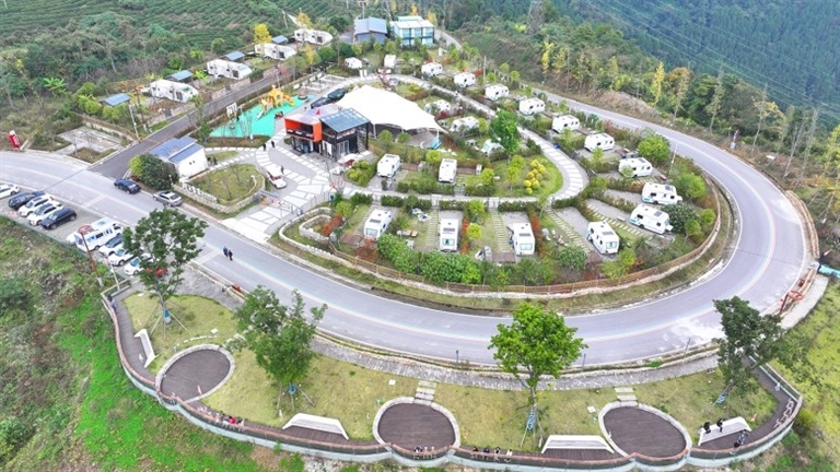 露营平台错落有致,树屋掩藏于葱茏绿意间,充满未来感的太空舱点缀其中。游客或搭帐篷、系吊床,或围坐闲谈、静赏山景,沉浸于自然的怀抱。